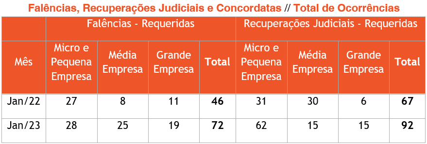 No que diz respeito aos pedidos de Falência, a mesma fonte registra 72 requerimentos em janeiro 2023: um aumento de 26 casos comparado aos números do mesmo mês do ano passado.