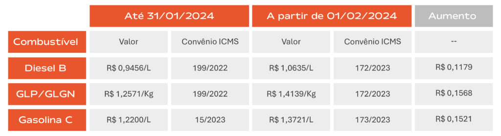 Após a publicação dos convênios mencionados, o CONFAZ emitiu os Convênios ICMS nº 172/2023 e nº 173/2023, os quais aumentaram os valores de referência (alíquota ad rem) para a incidência do ICMS e para o creditamento, conforme detalhado a seguir: